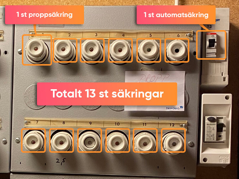 Räkna antal säkringar i ditt proppskåp, både proppsäkringar och automatsäkringar. Proppsäkringar hittar du i gamla elcentraler eller proppskåp som det också kallas. Automatsäkringar hittar du i nyare elcentraler men ibland kan äldre proppskåp byggts ut med några automatsäkringar.