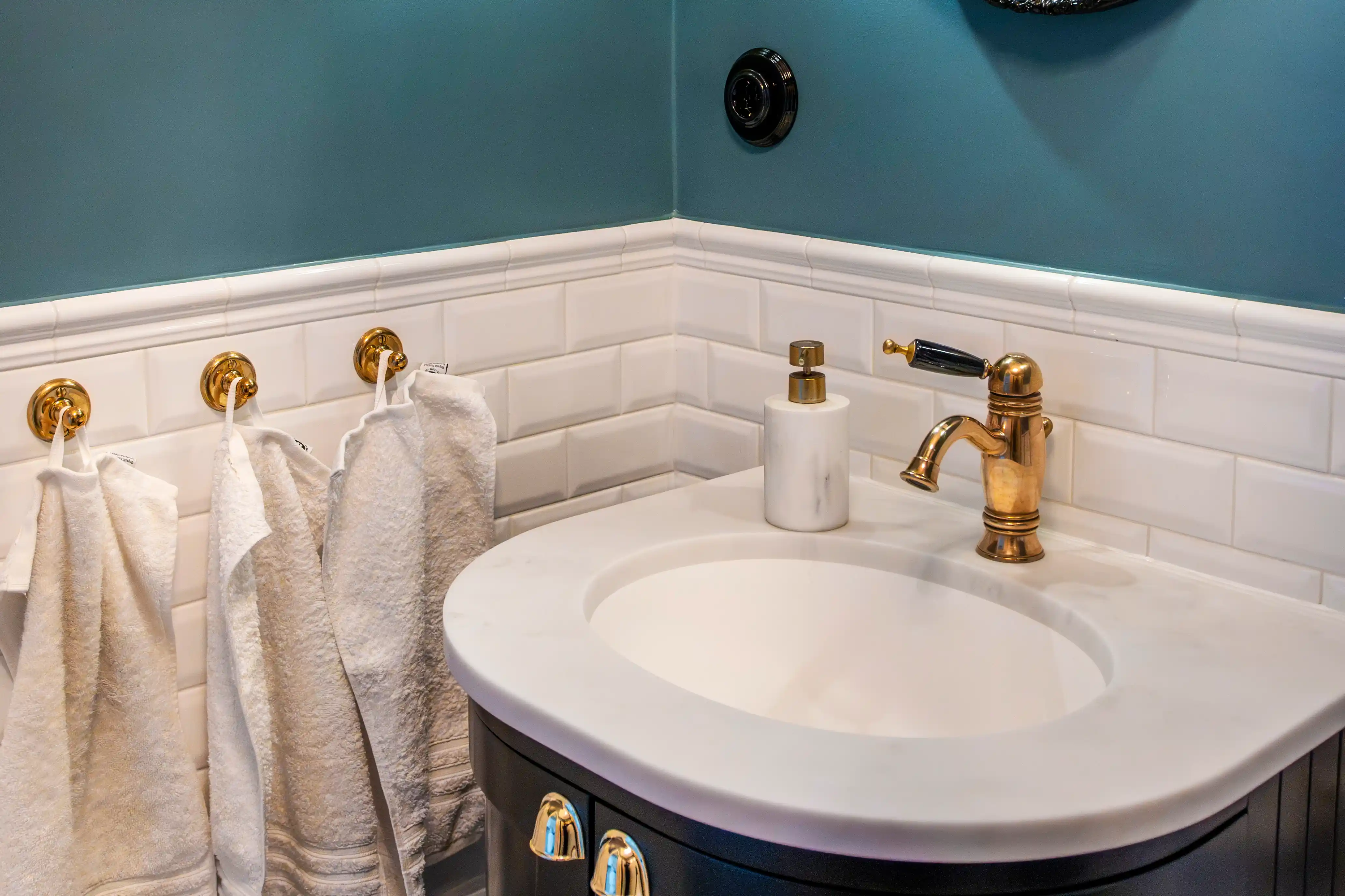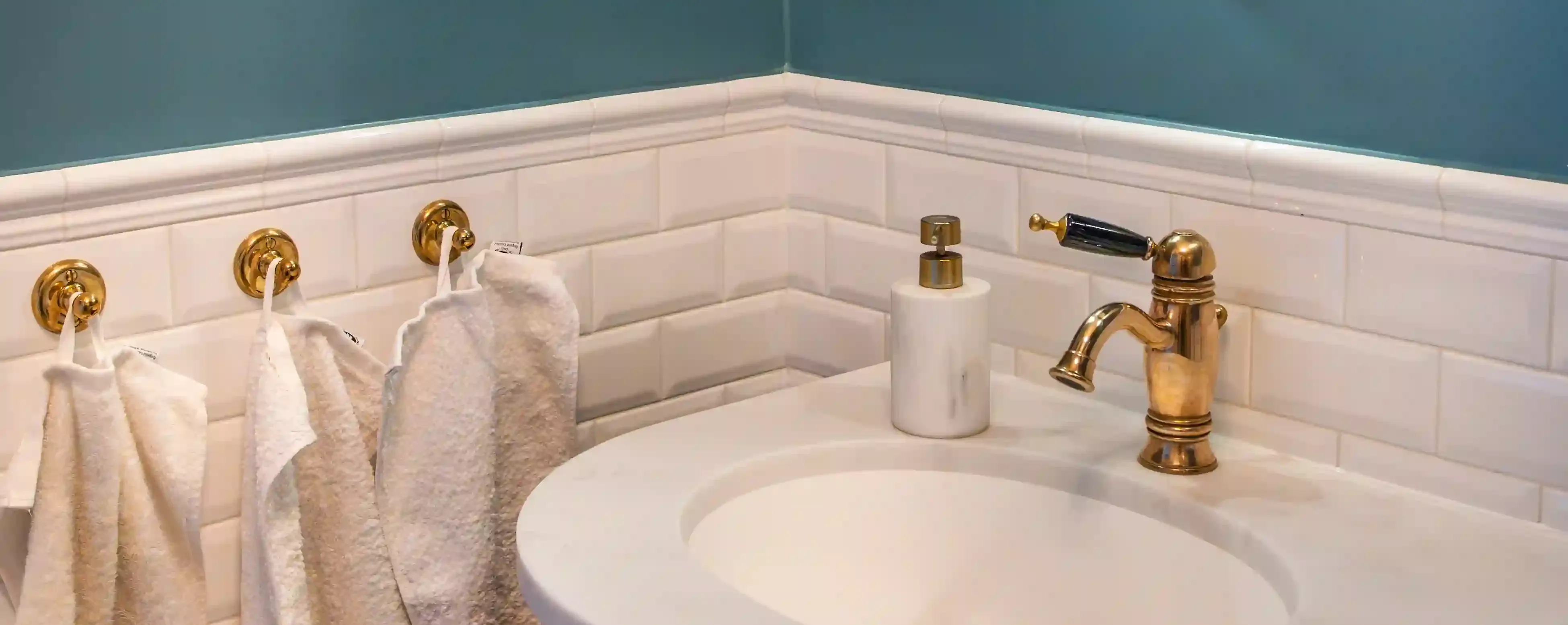 Väggarna är målade i en djup blågrön ton som direkt skapar karaktär. Färgen fungerar som en fond som lyfter fram både de vita kakelplattorna och rummets mässingsdetaljer.