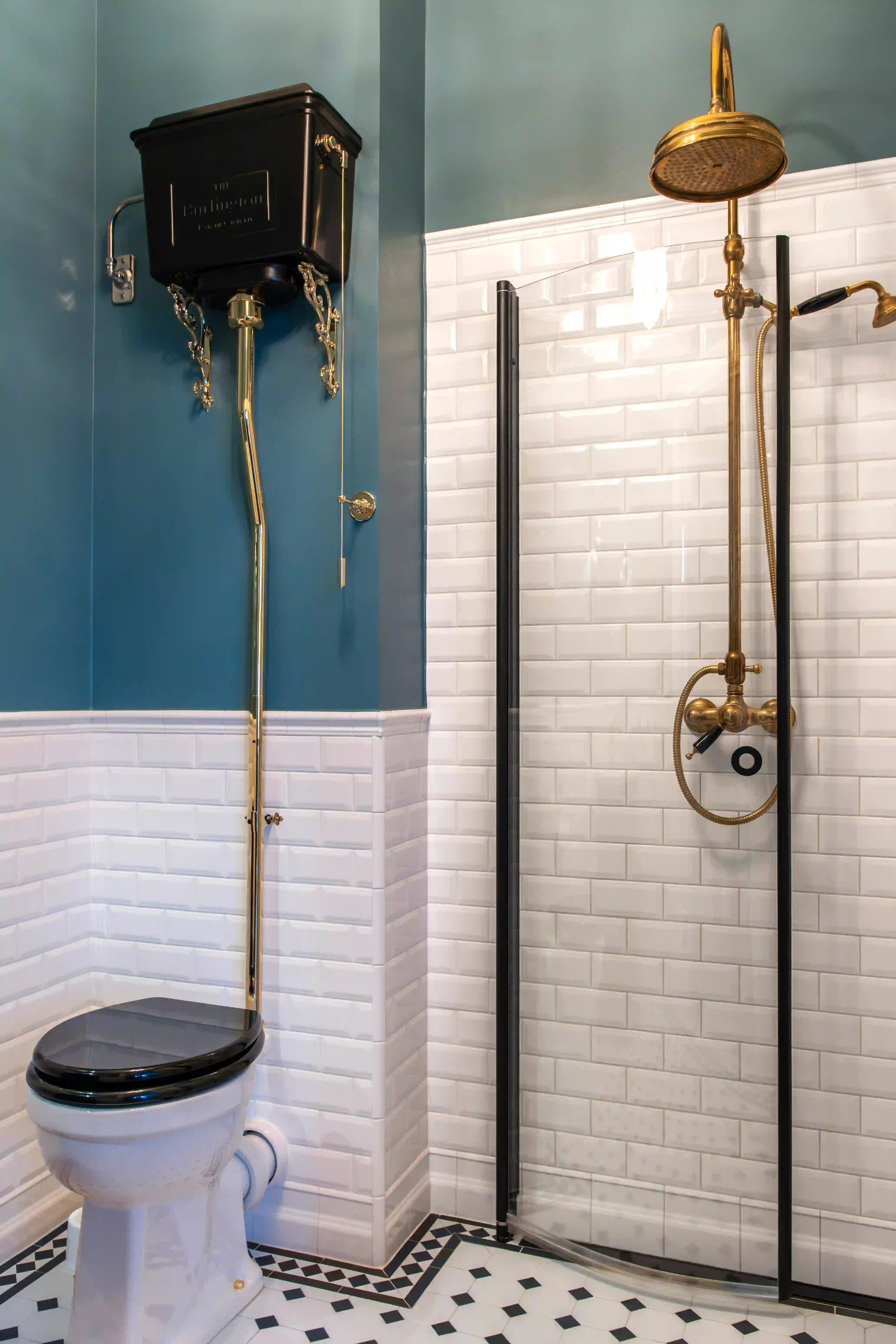 På motsatt vägg sitter en högspolande toalett vilket är en tydlig blinkning till äldre badrum där funktion och estetik gick hand i hand. Den svarta cisternen och de mässingsfärgade rören skapar ett starkt visuellt uttryck och förstärker rummets klassiska stil.