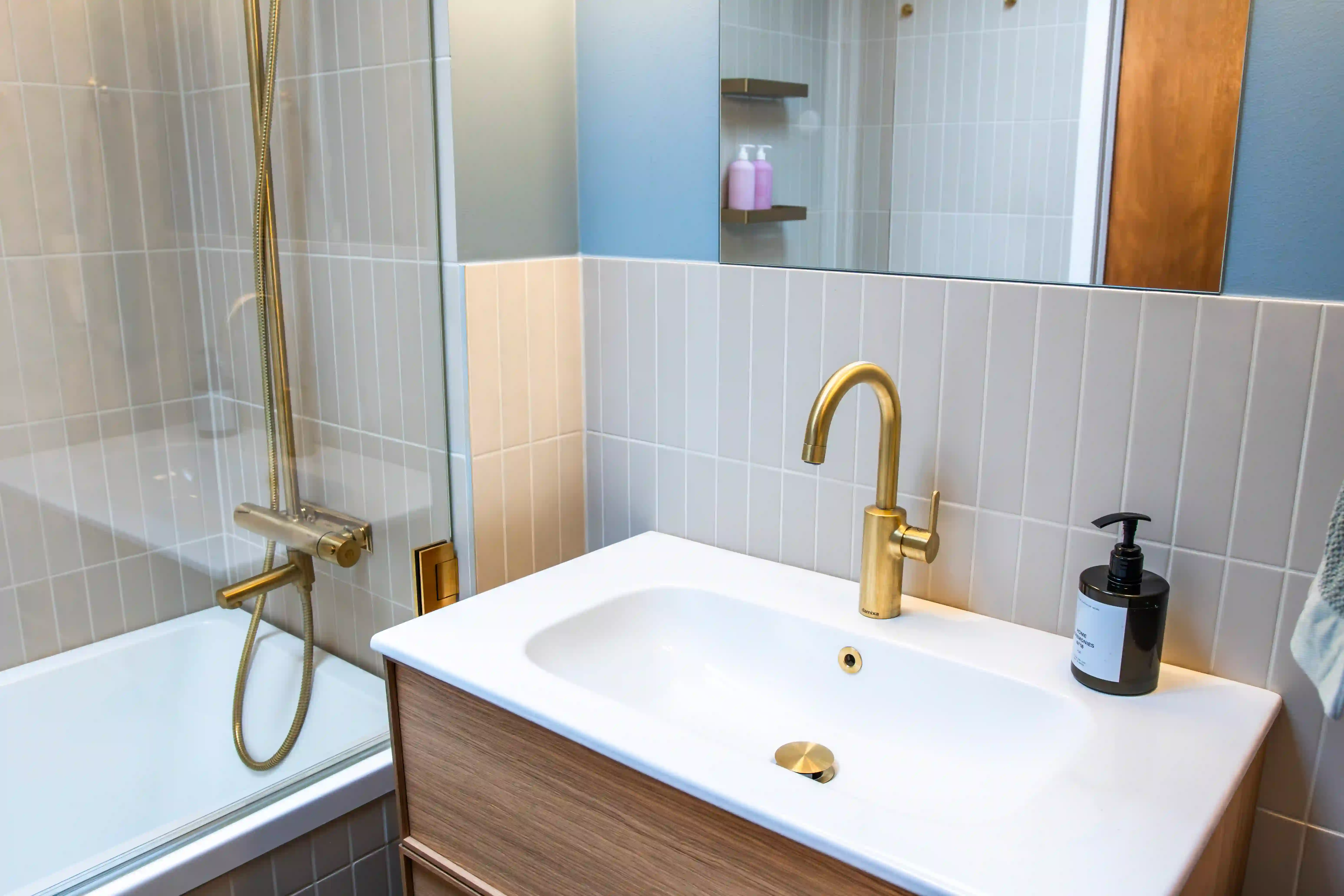 Det vita halvvägskaklet i klassisk metrostil bryter av och ger rummet struktur. Samtidigt förstärker det den tidstypiska känslan som återkommer i flera av badrummets detaljer och knyter ihop helheten.