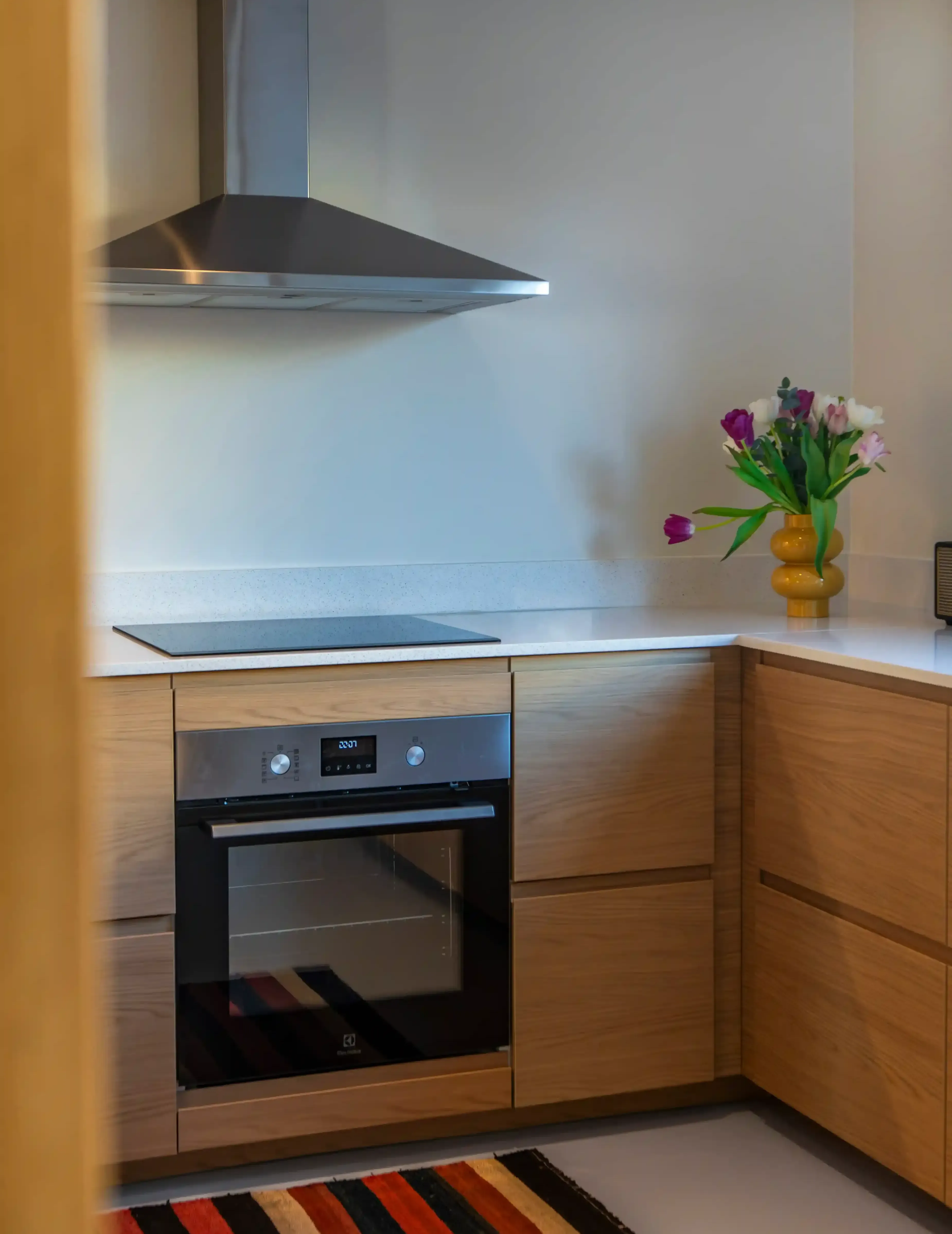 Belysningen under skåpen är infälld och ger ett jämnt arbetsljus över hela bänkskivan. Diskhon är sömlöst integrerad, vilket gör ytan enkel att torka av och hålla ren. En klar favorit i uppdateringen av köket - blandaren som är hög och smidig med ett utdragbart munstycke för enkel sköljning!