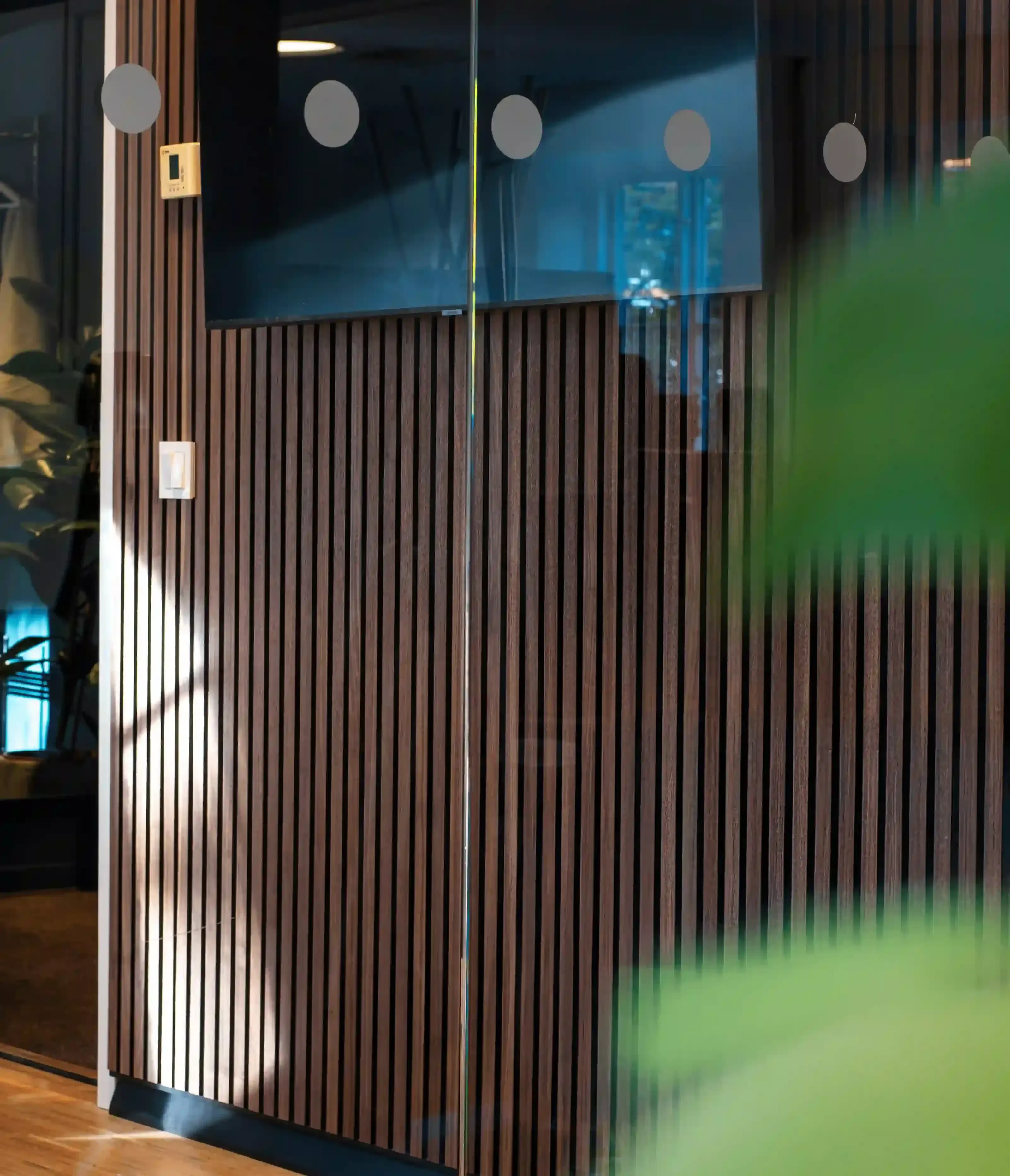 I våra mötesrum har det installerats akustikpaneler i valnöt från Wood on Wall tillsammans med deras LED-panel längs golvet som ger hela panelen ett snyggt lyft! De mörka tonerna i träet möter våra blå väggar på ett fint sätt och ger rummen en lugn, nästan hotell-lik atmosfär. Vi skulle beskriva våra mötesrum som tysta, varma och precis lagom formella.