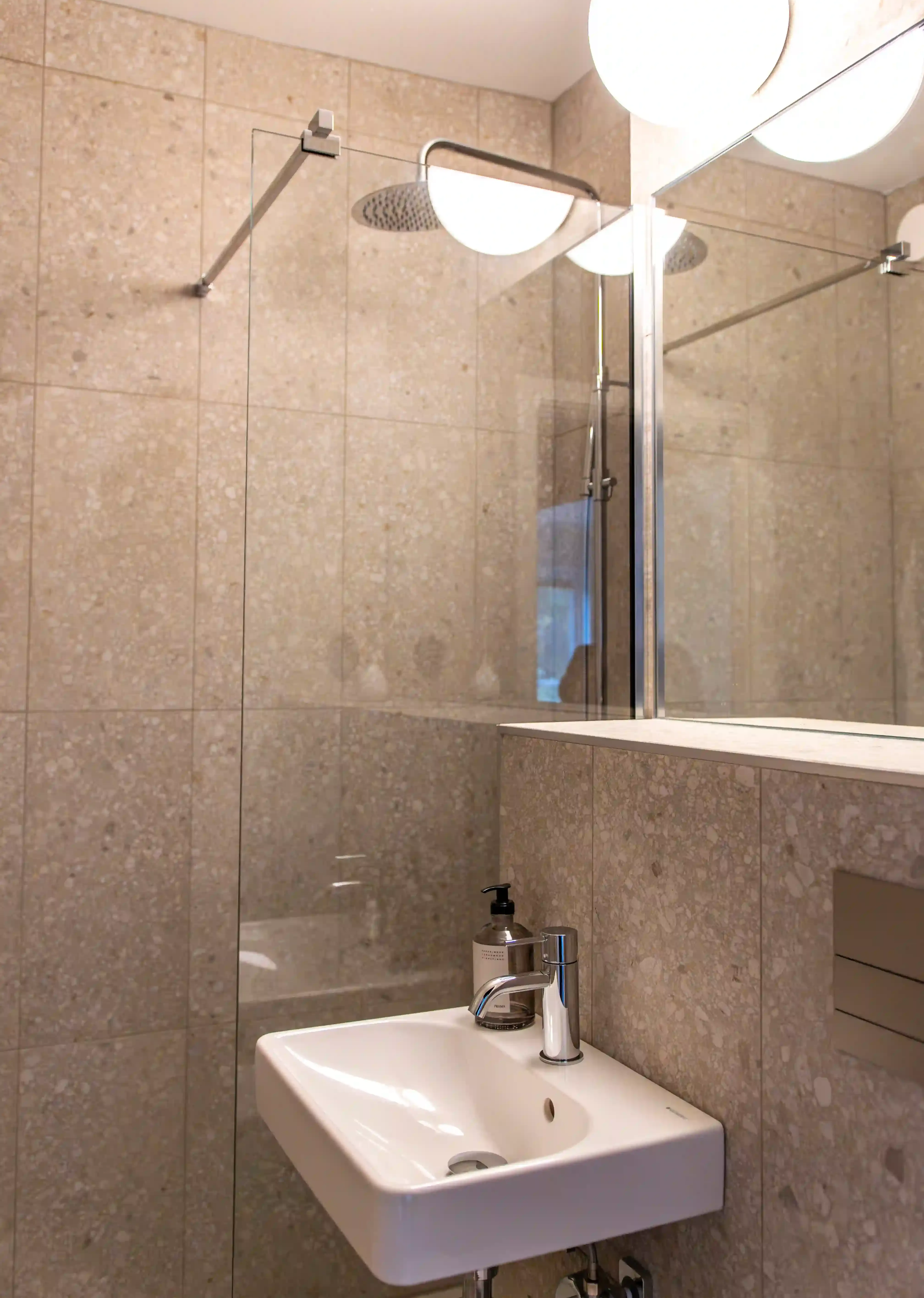 Det vägghängda handfatet och toaletten gör rummet mindre plottrigt och mer lättstädat, detaljer som blandare och dusch är enkla och funktionella. Den platsbyggda hyllan ovanför handfatet ger en självklar plats för dekorationer och vardagsprylar.