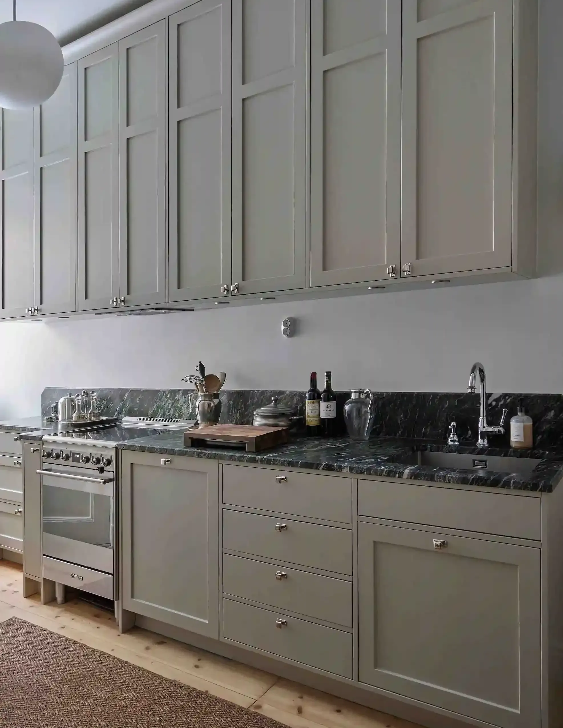 I köket ville Julia och John få in gott om förvaring utan att tumma på känslan av rymd. Lösningen blev platsbyggda skåp hela vägen upp till taket, målade i en sober grön ton som harmonierar fint med bänkskivan i mörkgrön marmor. Materialvalen ger köket både elegans och tålighet, perfekt för både vardagsmatlagning och middagar med vänner. Köket kompletteras med en bistrohörna, designad av Julia. De platsbyggda vitrinskåpen ovanför bistrohörnans sittbänk är utrustade med ledlister som ger ett stämningsfullt ljus – samtidigt som det sätter de fina glasen på display.