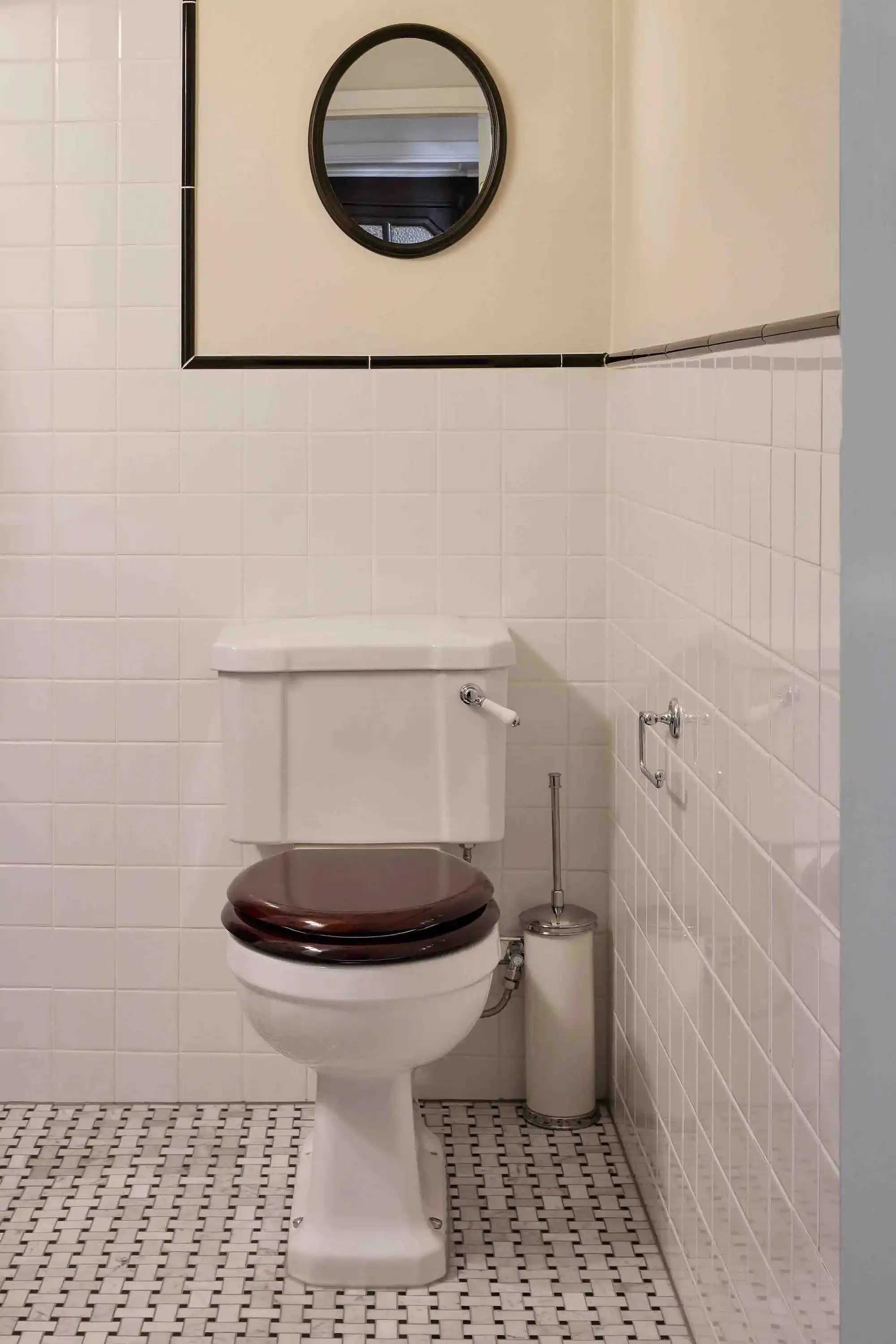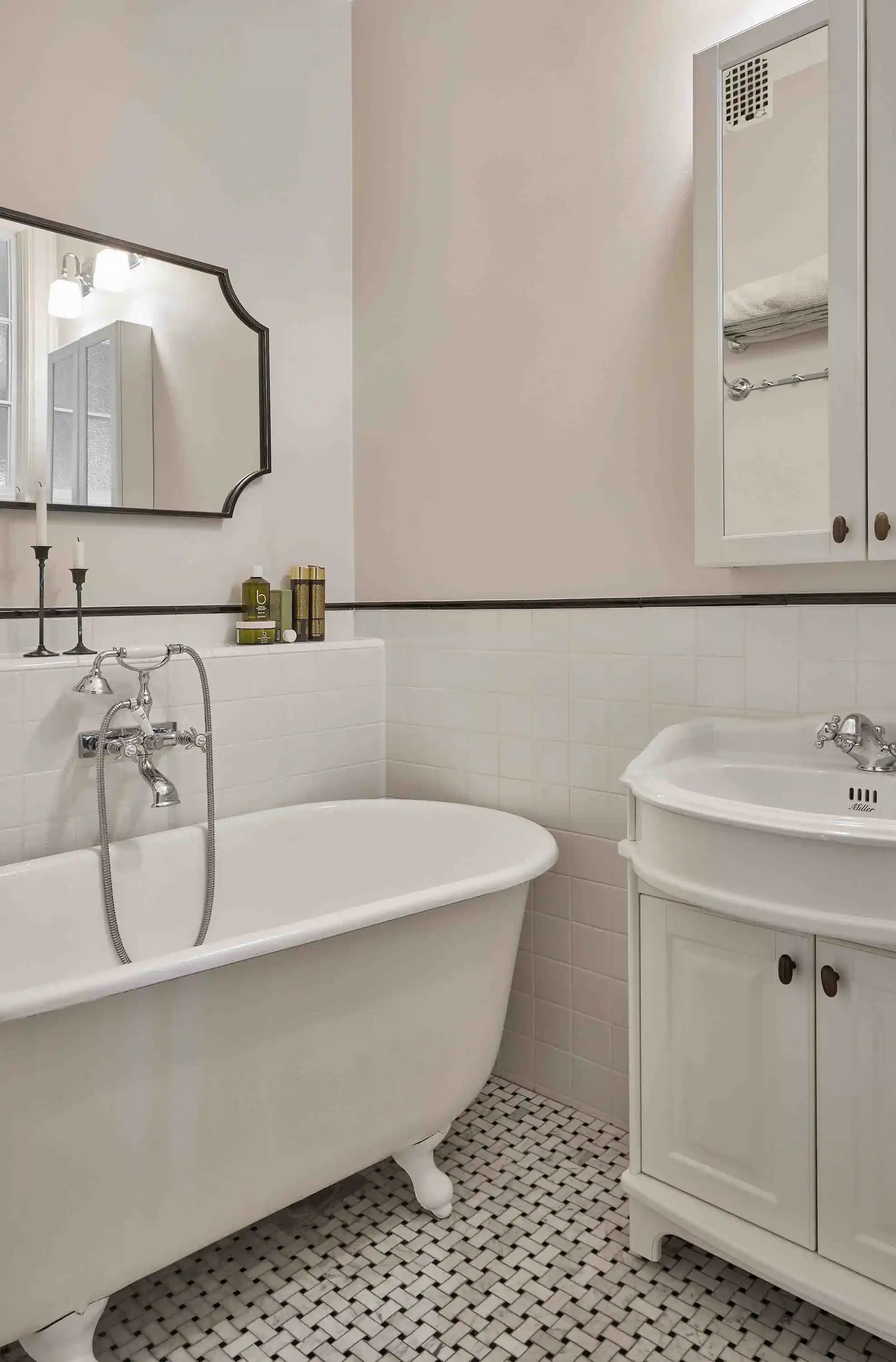 I badrummet möts charm och modern funktion i ett vitt halvkaklat rum där varje platta tillför karaktär. Den ljusa kakelsättningen skapar en luftig och fräsch känsla, något som förstärks av de golvplattorna med flätat mönster. Tillsammans bildar de en harmonisk kontrast mellan klassiskt och samtida. Över badkaret har vi byggt in en skräddarsydd hylla – platsbyggd för att smälta in i kakelsättningen och ge både form och funktion. Hyllan blir en praktisk detalj för avställning eller dekoration, utan att störa rummets stilrena uttryck.