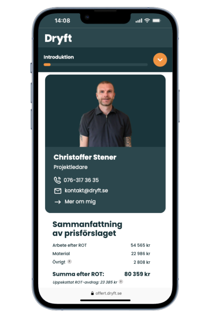 Du får en offert med fast pris och allt som ingår: arbete, material och tidplan. Med full överblick kan du ta beslut i lugn och ro.