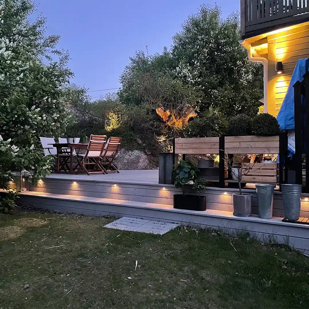 Det är vanligt att man vill ha en belysning på sin nya altan. Förutom bra ljus kommer lamaporna även att ge ett nytt utseende. Det finns många olika val, allt från mer enkla lösningar till mer påkostade investeringar. Det finns altanbelysning i alla prisklasser. Spotlights brukar vara ett populärt alternativ där man antingen kan ha utanpåliggande spotlight eller inbyggd i din trappa till exempel. När vi bygger in belysningen i trapporna på altanen ger det en mer lyxig känsla, det kräver även mer arbetstid vilket leder till extra kostnader. Det är vanligt att välja belysning vid trappor för att det blir enklare att se men också för att ge en snygg effekt. Vidare finns det andra former av belysning som lyser upp din fasad på ett snyggt sätt eller som ger schyssta effekter i din trädgård. Mer om utomhusbelysning